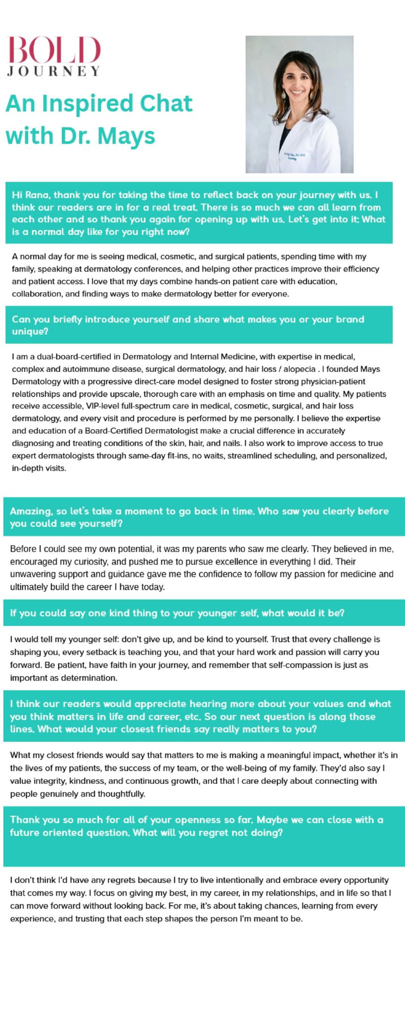Dr. Mays was recently hand selected by professionals in WOMEN IN MEDICINE as TOP DERMATOLOGIST 2020 !
